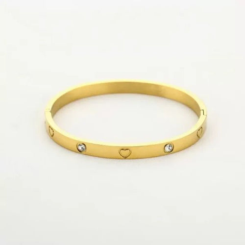 Diese Bangle mit Herzchen Gold ist aus hochwertigem Edelstahl gefertigt. Dieser Bangle hat die Maße 50×60 mm. Dies ist ideal, um eine freundschaftliche oder romantische Beziehung zu bekräftigen.