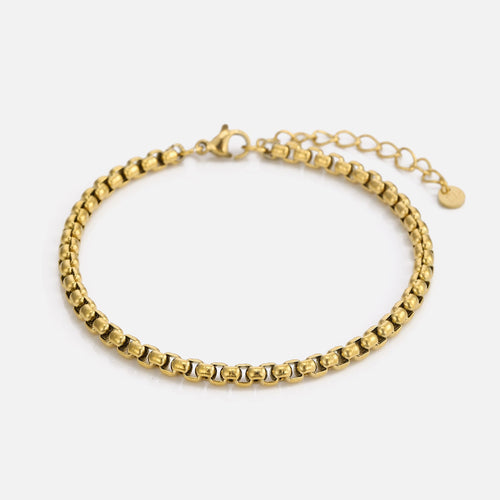 Diese Collier Armband 4 mm Gold Herren ist aus hochwertigem Edelstahl gefertigt. Die Länge des Armbands beträgt 19 cm und kann auf 23 cm angepasst werden.