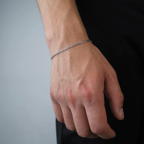 Diese Flache Gliederarmband 2 mm Silber Herren ist aus hochwertigem Edelstahl gefertigt. Die Länge des Armbands beträgt 19 cm und kann auf 23 cm angepasst werden.