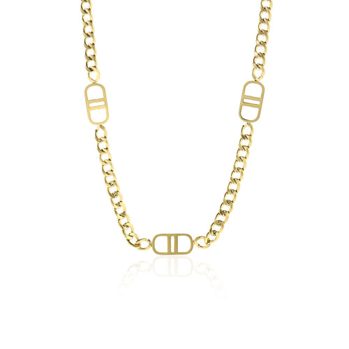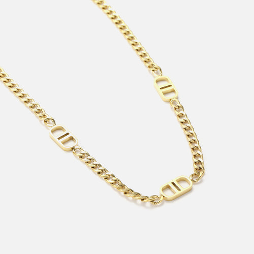 Diese Halskette Double D Gold ist aus hochwertigem Edelstahl gefertigt. Die Länge der Kette ist 40cm lang und kann auf 45cm verstellt werden. Dies ist die perfekte Kette, um all Ihren Looks einen Hauch von Raffinesse zu verleihen. Langlebig, stilvoll und angenehm zu tragen, ist sie ein Muss für jede moderne Garderobe.