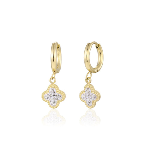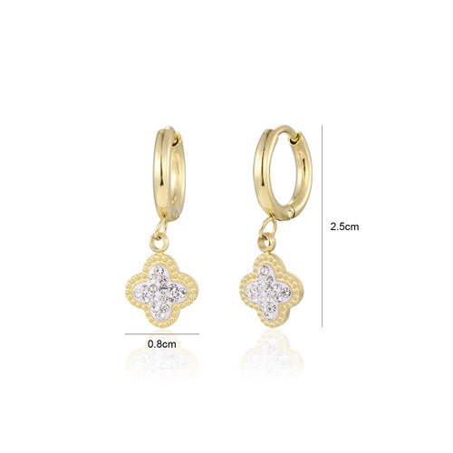 Diese Ohrringe Kleeblatt mit Strass Gold sind aus hochwertigem Edelstahl gefertigt. Die Ohrringe sind 2,5 cm lang. Diese Ohrringe sind perfekt, um all Ihren Looks einen Hauch von Raffinesse zu verleihen. Langlebig, stilvoll und angenehm zu tragen, ist sie ein Muss für jede moderne Garderobe.