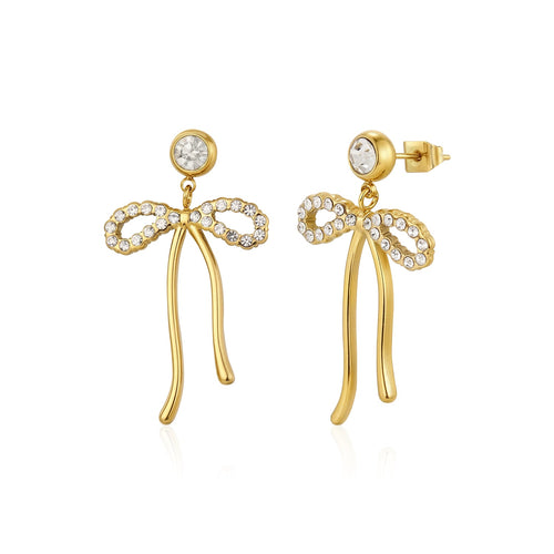 Diese Ohrrstecker Schleife mit Steinen Gold sind aus hochwertigem Edelstahl gefertigt und sind 3,7cm lang. Perfekt, um all Ihren Looks einen Hauch von Raffinesse zu verleihen. Langlebig, stilvoll und angenehm zu tragen, ist sie ein Muss für jede moderne Garderobe.