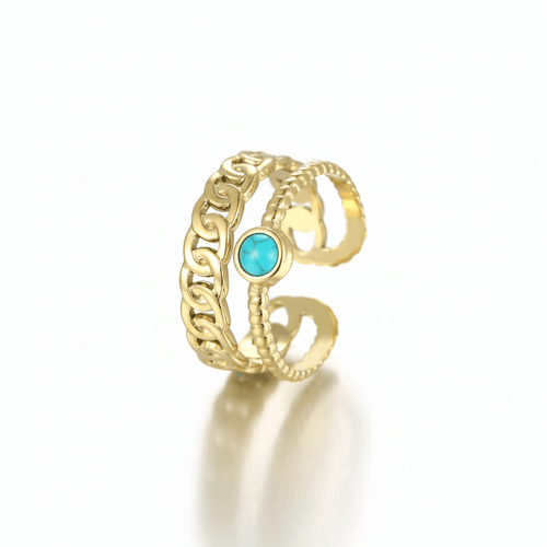 Diese Zweischichtiger Gliederring Gold/Türkis ist aus hochwertigem Edelstahl gefertigt. Der Ring ist verstellbar auf deine gewünschte Größe. Diese Ring ist perfekt, um all Ihren Looks einen Hauch von Raffinesse zu verleihen. Langlebig, stilvoll und angenehm zu tragen, ist sie ein Muss für jede moderne Garderobe.